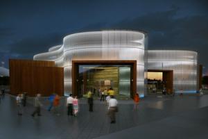 展馆形似一个呈波浪般起伏的水晶杯,又有大海中航船的意象。在造型复杂的钢结构和玻璃墙之外,覆有特制的钢丝网,加上大面...